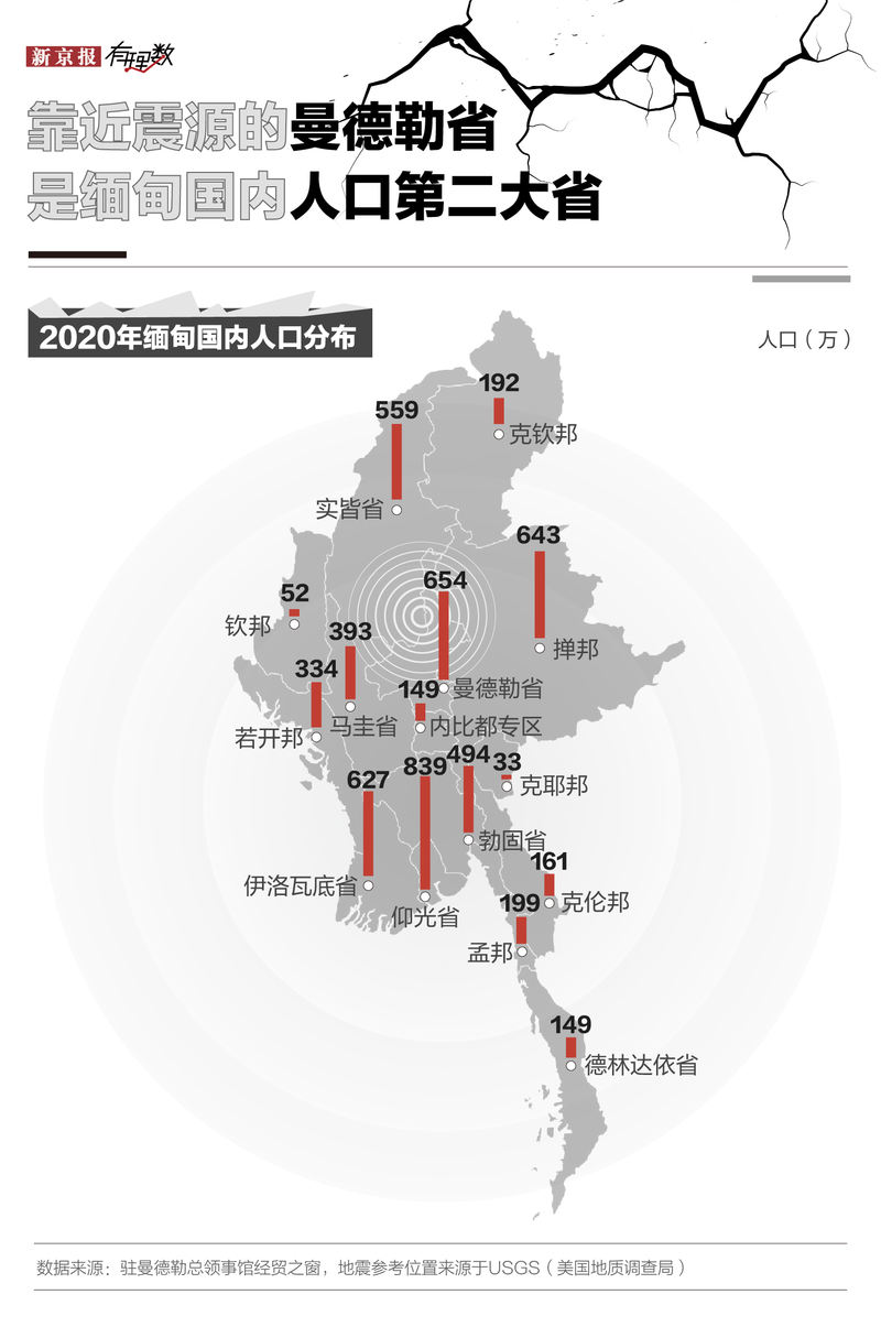 此次地震所在的断裂带途经了缅甸多个核心城市和人口稠密区,震中最近的曼德勒省是缅甸人口第二多省份,也是受灾最为严重的地区,内比都、曼德勒等人口密集城市都在地震断裂带的影响范围中。靠近震源的曼德勒市,是缅甸第二大城市,也是该国经济、政治和文化中心之一。