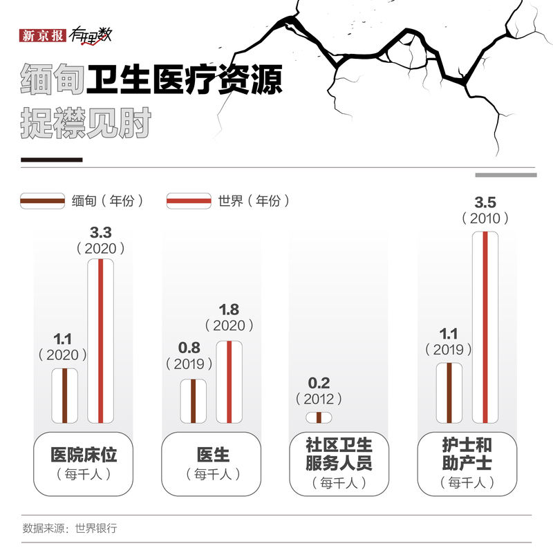 世界银行数据显示,2020年缅甸每千人医疗床位仅1.1张,不及全球平均水平,每千人拥有医生不到1名,医疗资源捉襟见肘,此次地震带来的影响更是雪上加霜。