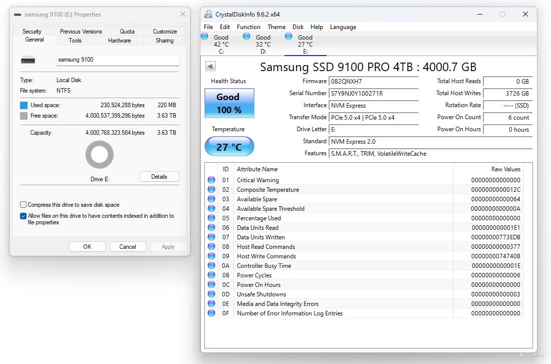 采用硬盘健康状况检测工具CrystalDiskInfo查看硬盘信息,我们看到三星9100 PRO PCIe 5.0 固态硬盘的固件版本位0B2QNXH7,传输模式为PCIe 5.0 x4,支持NVMe 2.0标准,支持S.M.A.R.T、TRIM以及VolatileWriteCache功能,待机温度为27度,其待机温度表现比同级产品有一定的优势。