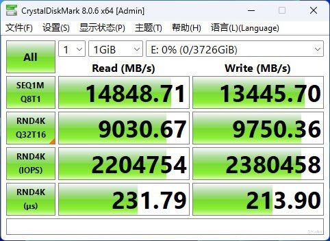 在性能测试环节,我们首先执行了CrystalDiskMark的空盘测试。结果显示,在1GiB的Seq Q8T1读写测试中,读取速度达到了14848.71MB/s,而写入速度则为13445.70MB/s,这两项指标均超过了三星官方公布的标称值。在4K随机读写性能方面,通过Windows平台上的CrystalDiskMark软件测试,我们得到了读取2204K IOPS和写入2380K IOPS的结果。整体性能十分出色。
