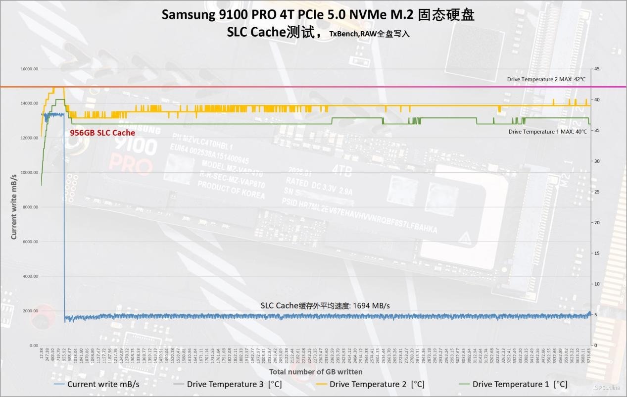 接下来,我们将对三星9100 PRO PCIe 5.0固态硬盘的SLC缓存容量进行测试。通过在RAW状态下使用TxBench进行全盘写入测试,并借助HWINFO64软件监控温度,我们发现其SLC缓存容量高达956 GB。