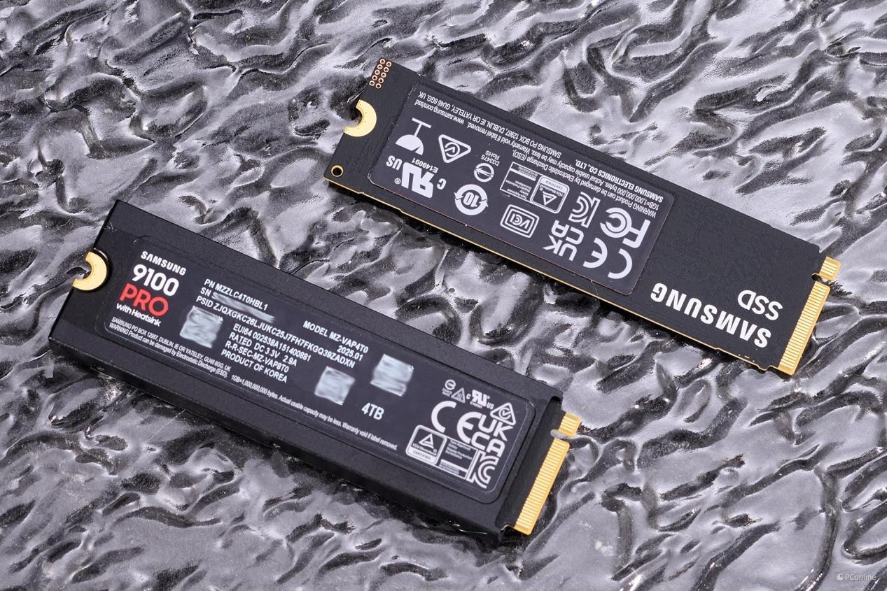 三星9100 PRO PCIe 5.0固态硬盘标准版与三星9100 PRO PCIe 5.0固态硬盘散热马甲版放一起一同展示。