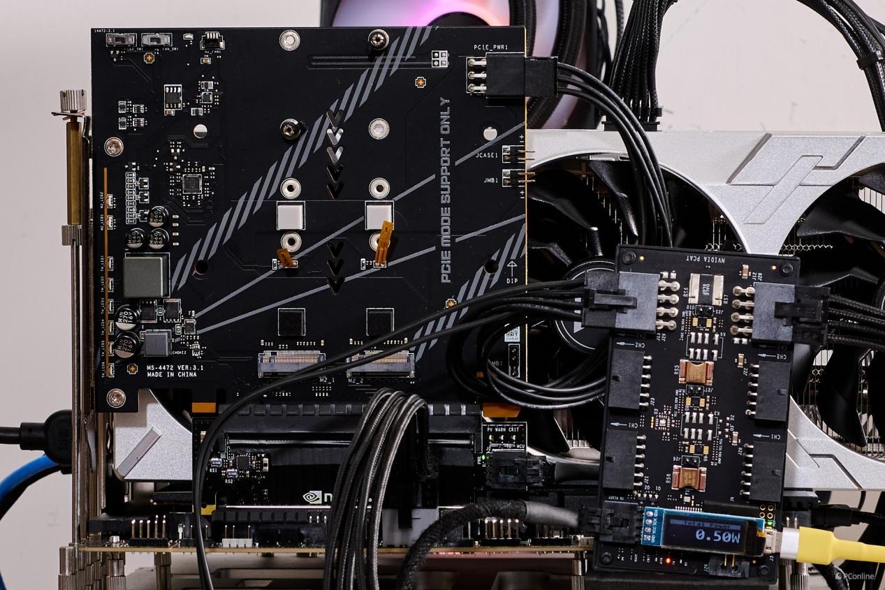 功耗测试方面,我们在微星M.2 Xpander-Z Gen 5扩展卡之上加入了NVIDIA PACT功耗 测试仪,一般情况下PACT测试是拿来测试显卡功耗表现的。既然同样是PCIe设备,那么使用PCAT设备同样可以记录功耗情况:PACT+微星M.2 Xpander-Z Gen 5扩展卡待机功耗为0.5W。