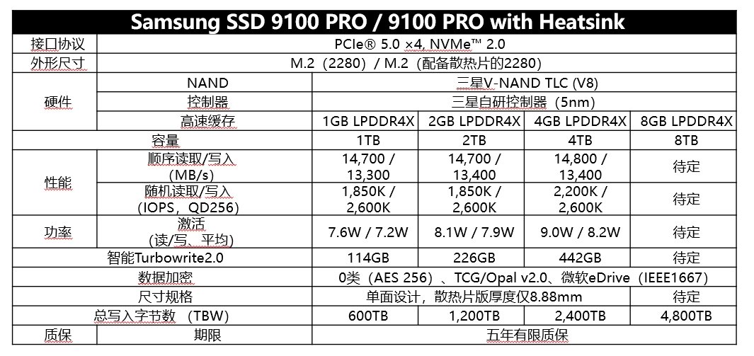 同时值得注意的是此次三星9100 PRO PCIe 5.0固态硬盘同时上市了标准版(裸条)和散热马甲版两种版本,容量有1TB、2TB、4TB、8TB四种版本。