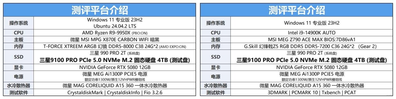 测试平台此次采用了两款,一个是AMD 锐龙9 9950X处理器+微星MPG X870E CARBON Wi-Fi 暗黑主板,另外一套平台为INTEL i9-14900K处理器+微星MEG Z790 ACE MAX战神主板,分别对三星9100 PRO PCIe 5.0 固态硬盘进行测试。