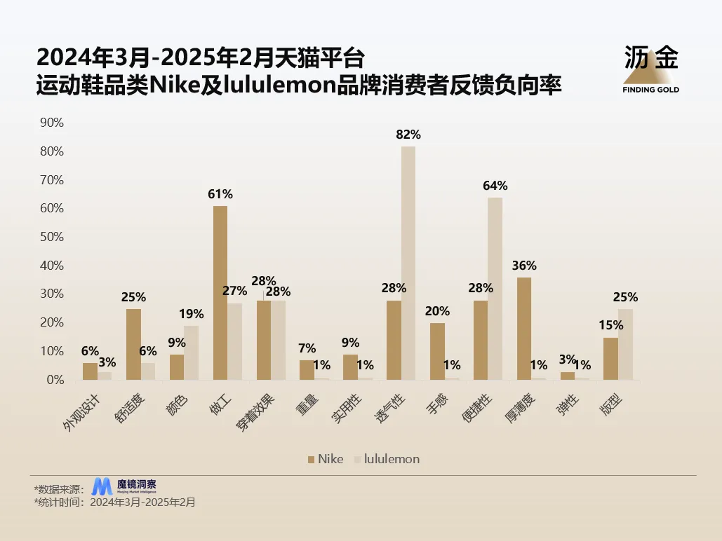 针对运动鞋品类而言,根据天猫平台运动鞋品类消费者反馈,lululemon在外观设计更胜一筹,但在透气性、穿着便携性方面不及Nike的消费者满意度情况。