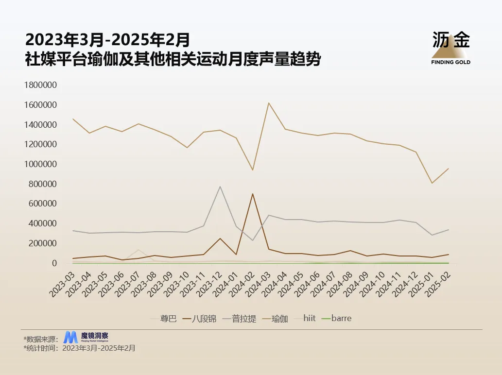 瑜伽的渗透率不断增高,已经成为一项大众化运动,甚至还不断被其他替代运动分流。社媒平台瑜伽话题声量基数大,但持续下滑,反观普拉提、barre声量均呈正增长趋势,持续瓜分原有瑜伽人群。