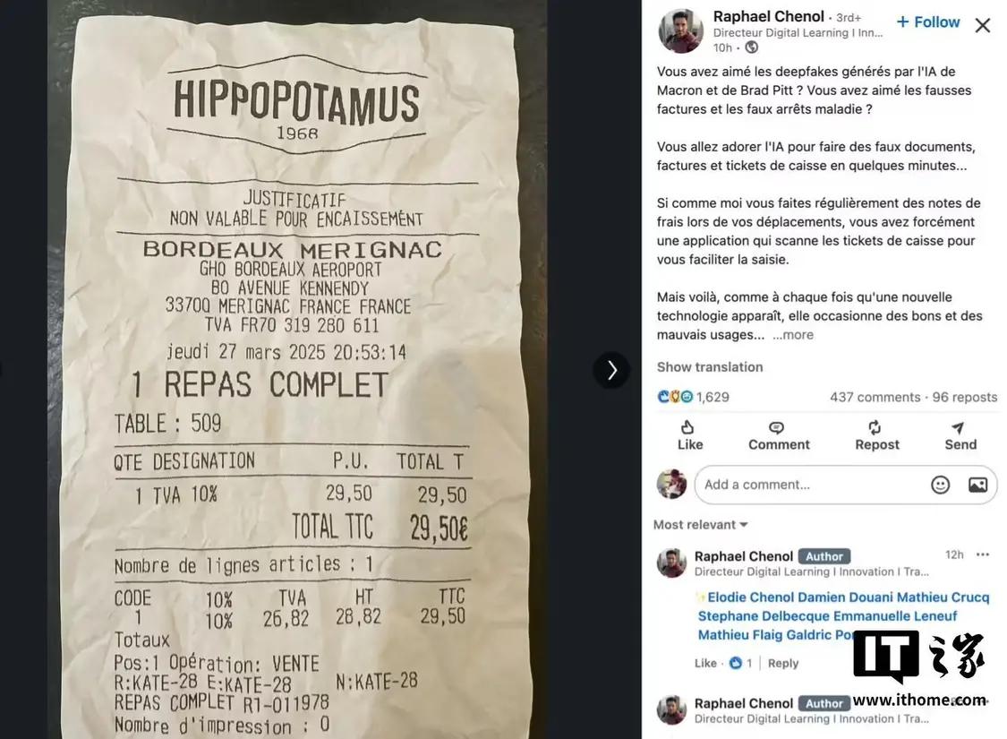 社交媒体用户、风险投资家德迪・达斯在X平台上发布了一张他声称是用4o生成的旧金山一家真实牛排餐厅的假收据照片。随后,其他人也成功复制出了类似的结果,甚至有人添加了食物或饮料污渍,让收据看起来更加逼真。IT之家注意到,最逼真的例子之一来自法国,一名领英用户发布了一张当地餐饮连锁店的皱巴巴的AI生成收据。