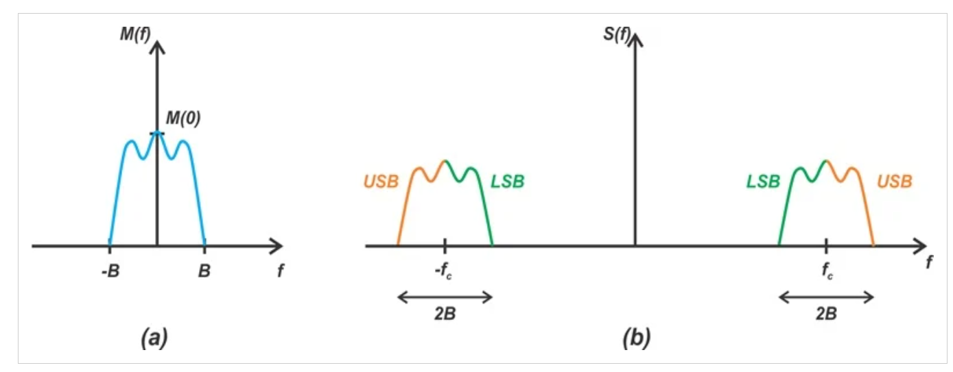 图1 基带消息信号的频谱(a)和DSB-SC信号的频谱(b)。上边带和下边带分别用USB和LSB表示。图片由Steve Arar提供