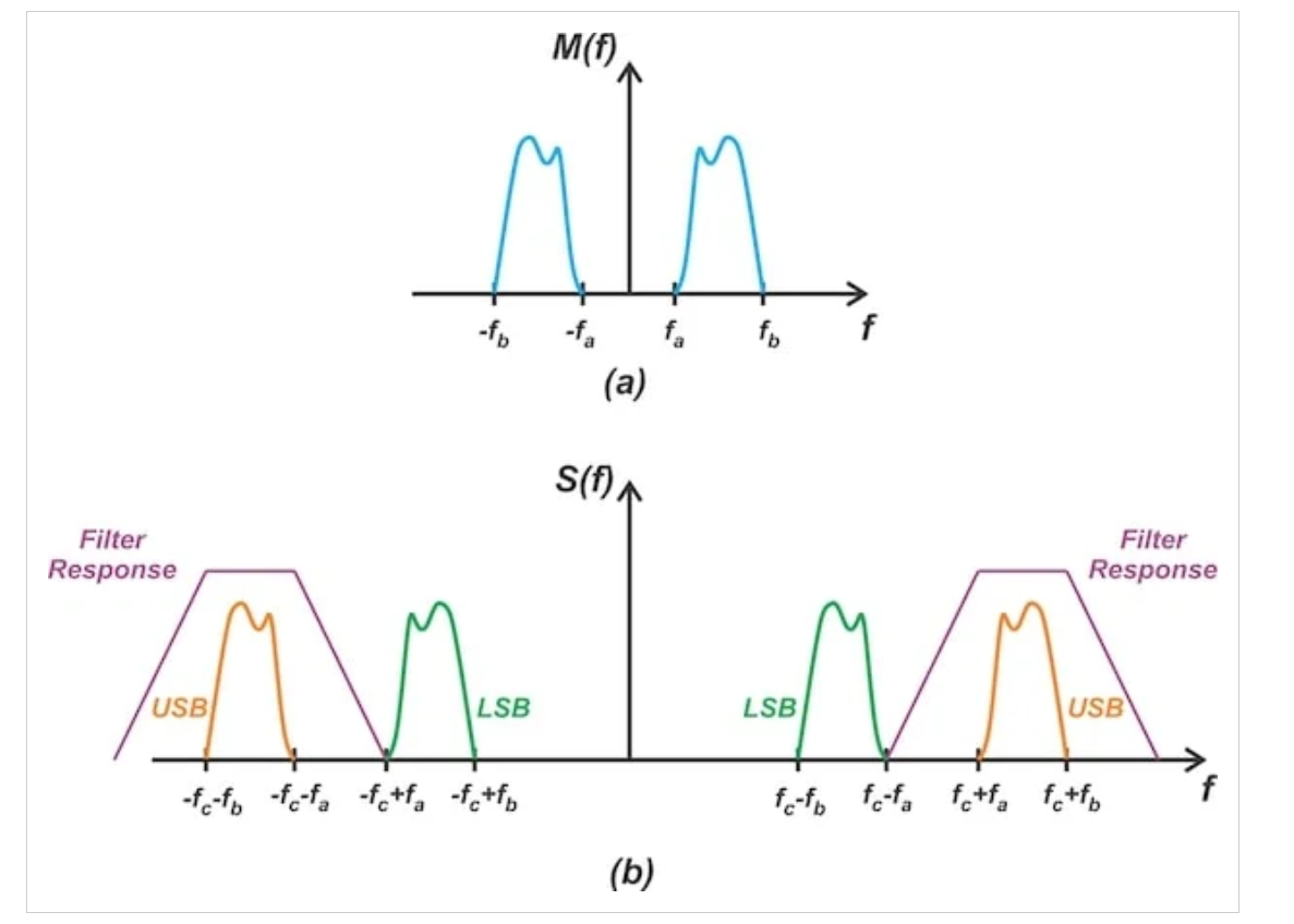 在上图中,fa是消息信号的最低频率分量。这导致DSB信号在fc处存在一个能量间隙。图4(b)中的紫色曲线展示了保留上边带所需的滤波器响应。