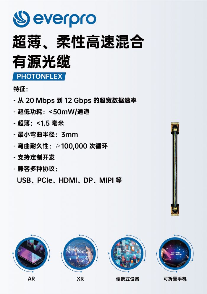 超薄、柔性高速混合有源光缆,支持从20Mbps到12Gbps的超宽数据速率,兼容USB、PCle、HDMI、DP、MIPI等多种协议标准,支持定制化设计开发,满足不同应用场景需求。