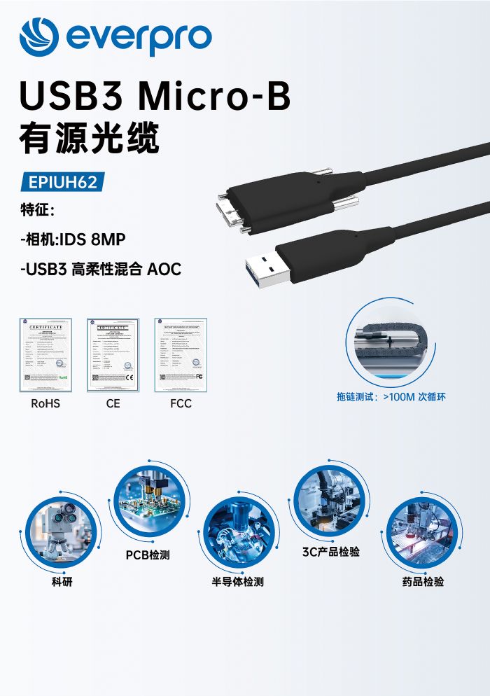 USB-MicroB高柔AOC,专为机器视觉设计,通过了超1亿次的拖链测试,广泛应用于科研、PCB检测、半导体检测等行业领域。