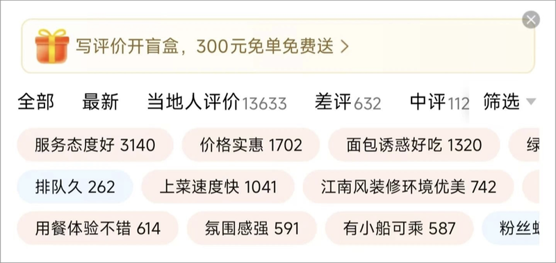惊蛰研究所也发现,时至今日,绿茶官网上的“招牌美食”页面依旧把面包诱惑放在首位,而在大众点评上随机打开一家绿茶餐厅的评论区,也是“价格实惠”“面包诱惑好吃”等评价标签占据了醒目位置。