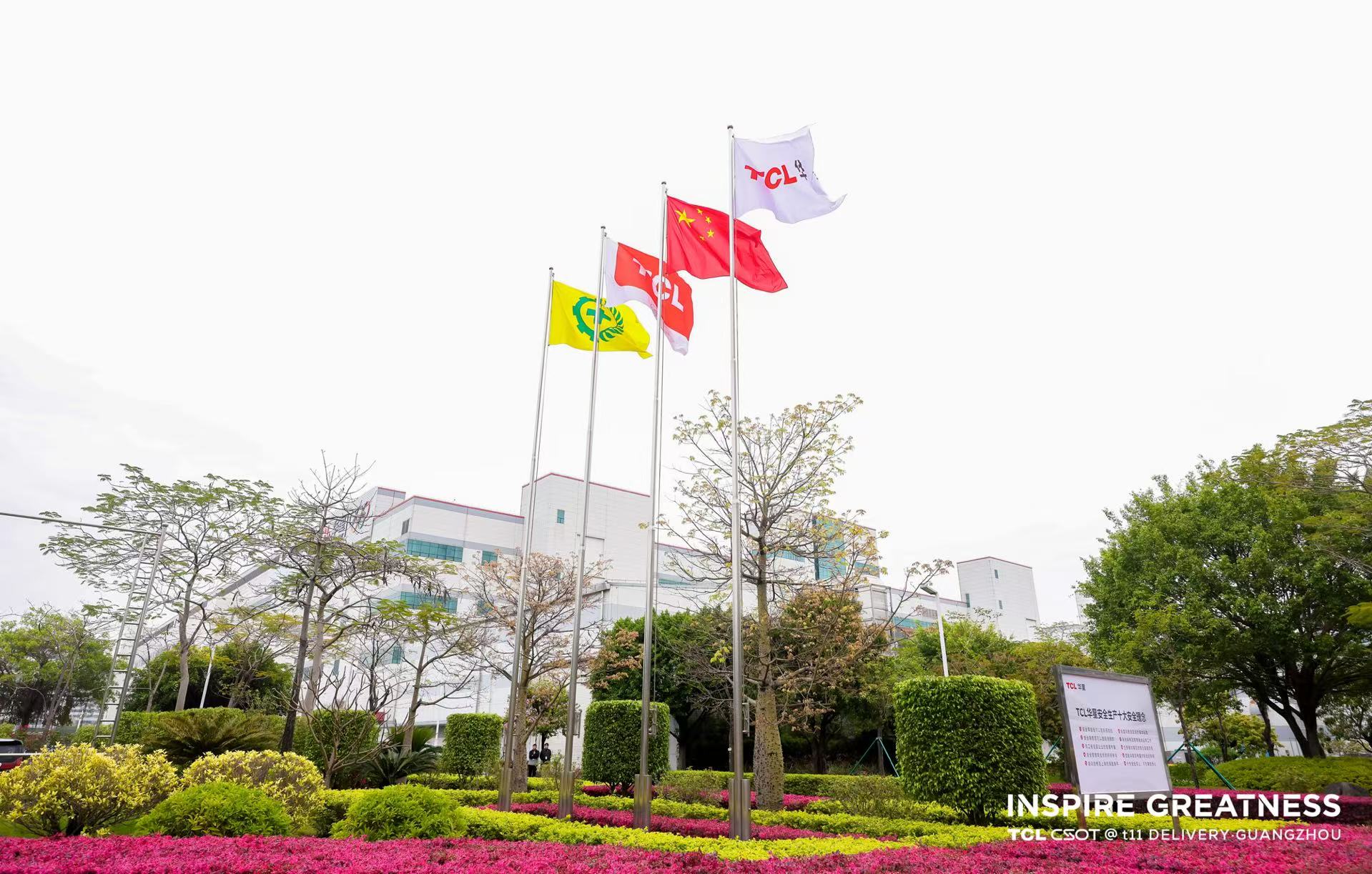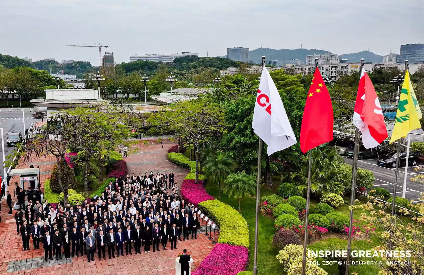 t11 基地广场上 TCL 华星的领导和员工们整齐列队,气氛庄重而热烈。伴随着激昂的国歌和热烈的TCL之歌,鲜艳的五星红旗、TCL 司旗冉冉升起,员工们庄严肃立,共同见证这一历史性时刻。