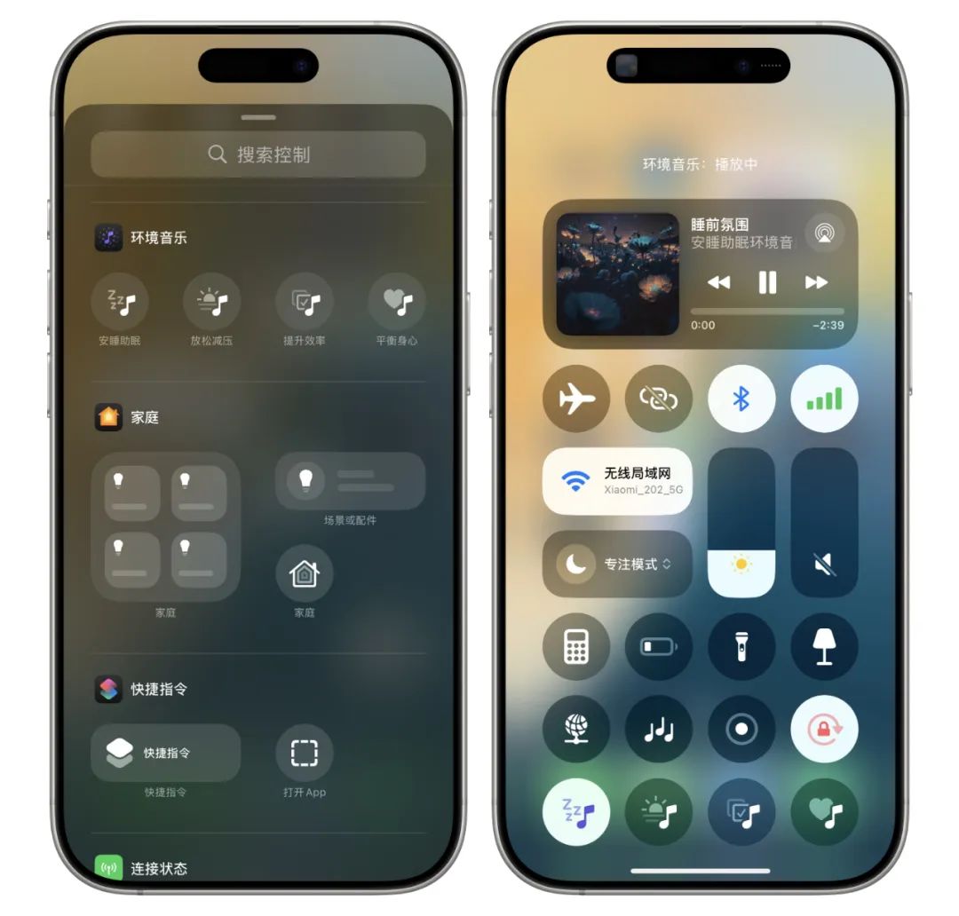 另外,还新增了环境音乐:现在进入控制中心里面,添加控制功能,便可看到四个全新的环境音乐,分别是助眠、减压、效率和平衡,添加后点击即可播放,这个功能类似于之前就原有的白噪音。