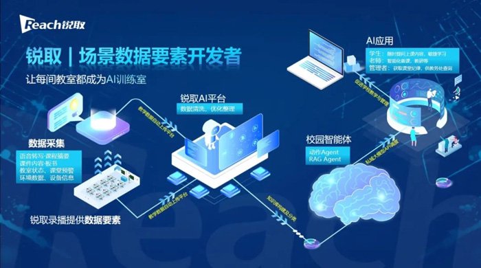论坛现场,林义苏正式宣布锐取崭新定位:AI⁺场景数据要素开发者。锐取将发挥录播技术优势,每间教室以详细的数据呈现并自动上传,为锐取AI平台提供数据要素,通过锐取AI平台的数据清洗、深度分析打造校园智能体,为学校教学与管理带来全新的智能服务体验。