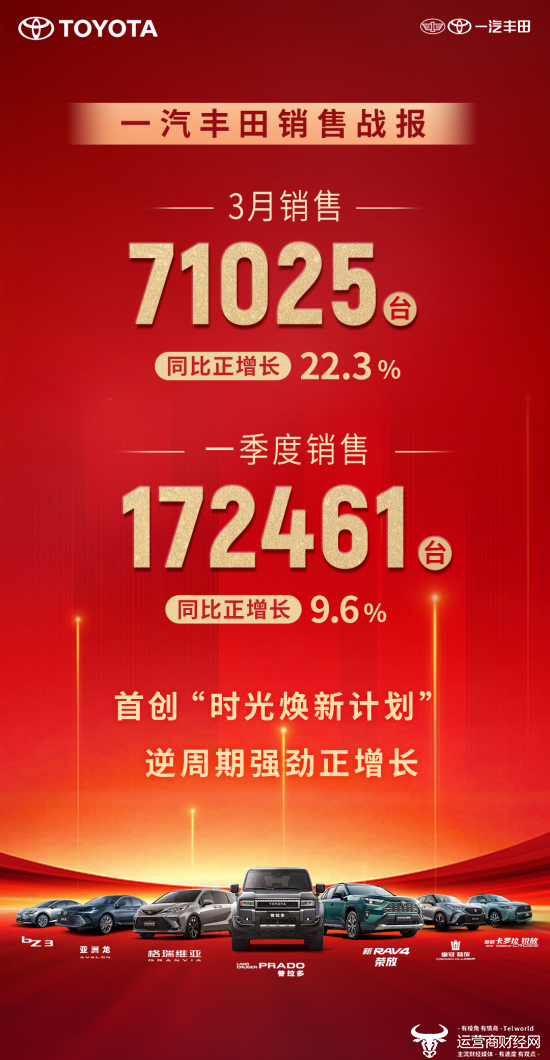 4月1日,一汽丰田率先公布了3月及一季度销量数据。3月,一汽丰田销售新车71,025台,同比增长22.3%;整个2025年一季度,累计销售新车172,461台,同比增长9.6%。这是继连续两年成为正增长主流合资车企之后,一汽丰田再次创造的新增长记录,续写了“合资亮色”。