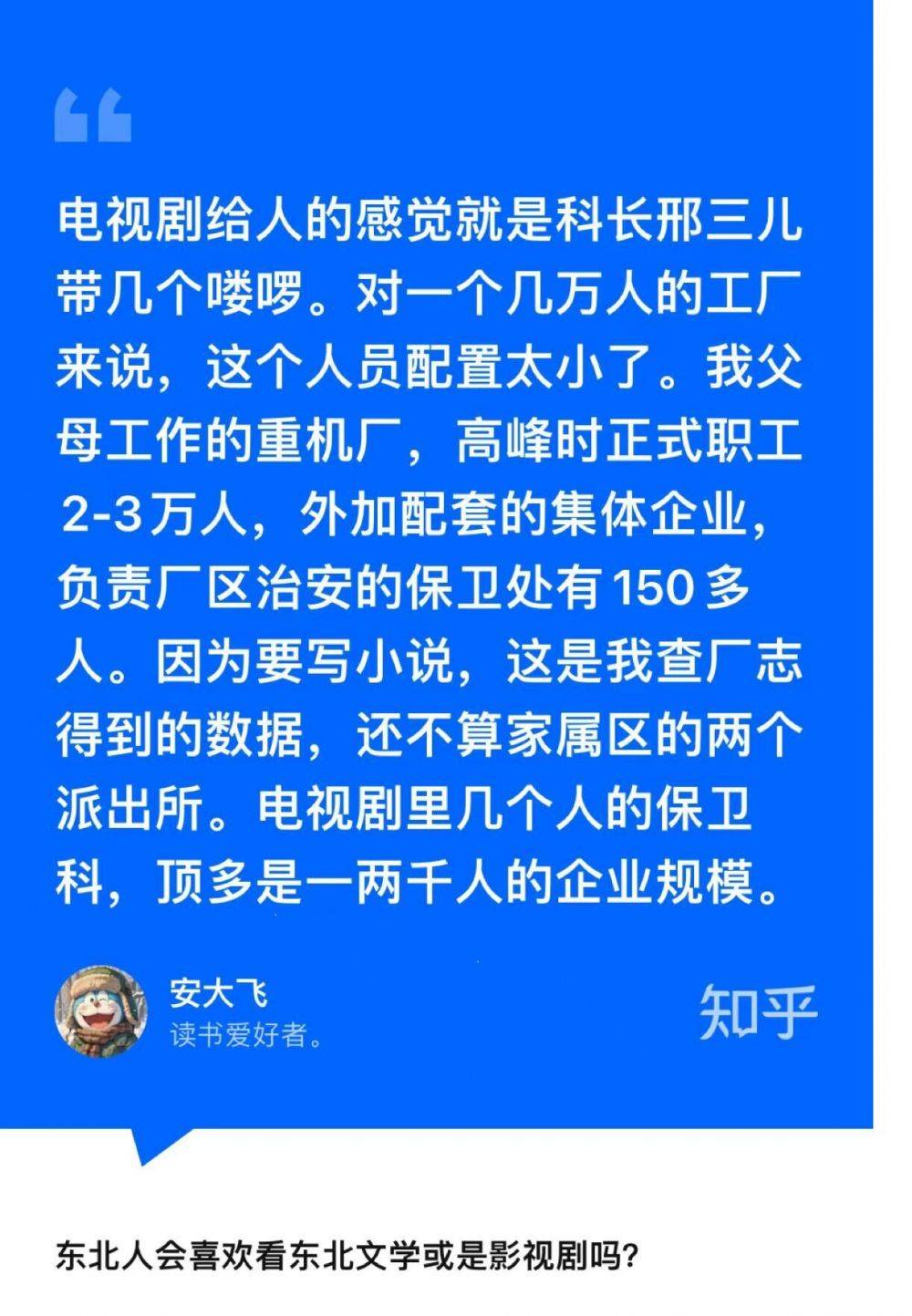 “东北人会喜欢看东北文学或是影视剧吗?”东北作家安大飞的回答是“会”。他以《漫长的季节》为例,表示这部优秀的剧集仍有细节完善的空间,例如剧集中的保卫科人员太少了,“我父母工作的重机厂,高峰时正式职工有2 - 3万人,外加配套的集体企业,负责厂区治安的保卫处有150多人”。