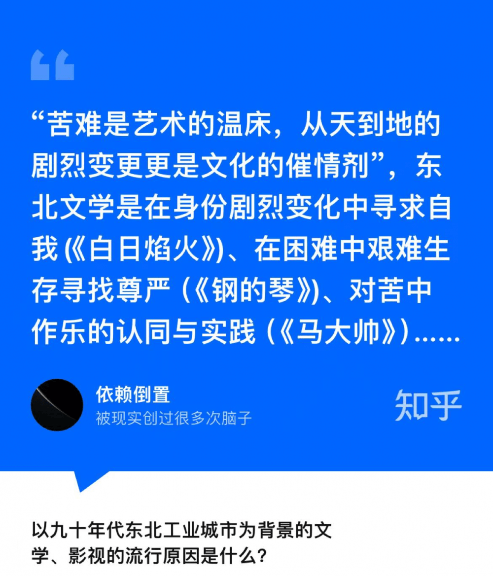 在知乎用户的回答中,《人世间》《平原上的摩西》《乡村爱情故事》等影视剧被反复提及。知乎答主“依赖倒置”是这样回答称,“苦难是艺术的温床,从天到地的剧烈变更更是文化的催化剂。东北文学是在身份剧烈变化中寻求自我(《白日焰火》)、在困境中艰难生存寻找尊严(《钢的琴》)、对苦中作乐的认同与实践(《马大帅》)”。