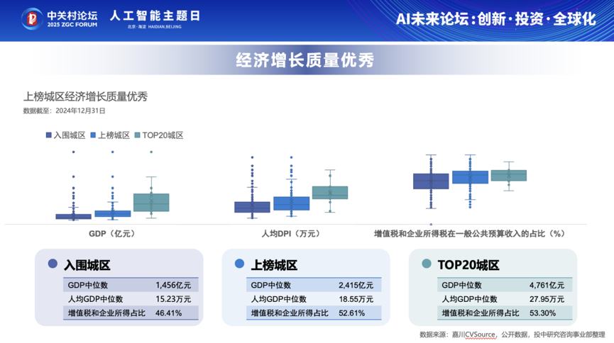 对于创投行业而言,区域发展质量不仅影响着资本的流向,还直接决定了创新生态的活力和可持续性。那么,在科技创新与资本集聚的双重驱动下,哪些城区正在引领创投风向?哪些城区又最具创投价值?3月31日,在2025中关村论坛年会「人工智能主题日」核心论坛——"AI未来论坛:创新·投资·全球化"上,投中信息CEO杨晓磊揭示了答案。通过深入研究全国所有GDP超千亿的县级行政区以及经济功能区的创投氛围和发展质量,投中信息评选出了2024年度“最具创投价值”城区TOP100。本次论坛由北京市海淀区人民政府主办,北京中关村科学城创新发展有限公司、北京中关村创业大街科技服务有限公司、投中信息、清华大学五道口金融学院共同承办。杨晓磊在解读中指出,京津冀、长三角、粤港澳大湾区的上榜城区占比高达77%,这些区域凭借政策红利、产业协同、资本聚集等方面的绝对优势,吸引了大量优质企业和人才聚集,并形成了强大的经济辐射力和产业影响力。此外,通过对比上榜城区的新增融资企业可以发现,创投资源的马太效应在区域发展中得以充分体现,融资密度分化,资本向头部城区高度集中——上榜城区2024年新增融资企业中77%位于上海、苏州、深圳、北京、杭州、南京、成都、广州8个城市,TOP5区域融资企业总数更是占到百强的23%。以下为杨晓磊演讲实录,由投中网整理:尊敬的各位领导、来宾、朋友们,大家下午好!我是投中信息杨晓磊,今天非常荣幸站在这里为大家解读和发布《2024年度中国最具创投价值城区榜单》。这份榜单是基于对200多个城区进行数据分析,结合了区域发展质量和区域创投氛围等核心指标,最终评选出本年度最具创投价值的区域100强。接下来我将用10分钟时间,从评选逻辑、关键发现、区域亮点三个维度给大家解读。本次榜单的评选对象聚焦在2023年GDP超过1000亿元的三类区域:第一类是行政区,如大家熟悉的海淀、浦东新区等;第二类是经济功能区,如北京经济技术开发区、苏州工业园区等各类高新区、开发区;第三类是“政区合一”,比如苏州高新区、广州开发区等。我们遵循数据公开可获得、指标科学合理、评选方法可执行可持续的原则来设计这个榜单,所以在指标的设计上,我们重点考察了三个维度:一是经济水平及增长质量。核心指标包括GDP、GDP增速、人均GDP、增值税,以及增值税和企业所得税占财政收入的比重。同时我们还关注其他衡量区域经济的指标,比如产出效率和财税健康度,要突出可持续发展能力;二是人文环境价值。比如说常住人口情况,科教文卫的投入;三是创投活跃度。通过新增企业数量、新增融资企业数量以及二者的增速指标来评估创投的发展质量。所有的数据均来自于政府公告、政府公报、投中嘉川CVSource数据库,确保榜单的权威和客观性。从榜单结果来看,我们有四个核心发现:一是城区显著聚集。京津冀、长三角、粤港澳大湾区三个城市群表现突出,占据整个上榜区域的77%,这一数据基本印证了国家级城市群在政策红利、产业协同、资本聚集等方面的绝对优势。二是经济实力雄厚。上榜城区的经济体量整体比较强劲,GDP超万亿有两个,分别是海淀区和浦东新区;500亿以上有11个,GDP中位数达到2415亿。这反映出头部城区已经形成经济高原,对全国经济增长的拉动作用十分显著。三是融资密度分化。资本向头部城区高度集中,前五名的城区融资企业总数占百强的23%,中后端城区融资活跃度相对较低。这还是入围100名的,这些现象表明创投资源的“马太效应”依然强劲。四是经济功能区表现亮眼。上榜区域中经济功能区(含政区合一”模式区域)占比达23%,这些功能区在高新技术产业、税收贡献、政策灵活度上面具有较大优势。我们做了一个分布,发现上榜城区高度集中在经济热点地区,比如江苏省、广东省和浙江省,分别以22个、18个、15个城区位居全国前列,凸显出长三角与珠三角的核心优势。超大城市中,上海、北京分别贡献了10个和7个城区,资源聚集效应较为显著。从区域的分布来看,呈现阶梯化特征:华东地区以58个城区独占鳌头,中南地区25个,华北、西南、西北合计占比不到20%,这还是北京贡献了7个城区的前提下,说明区域不平衡发展问题还是十分突出。下面看一下增长质量数据。排名越高的城区经济增长质量越优,税收贡献与产出效率显著增强,20个头部城区已经形成了一个经济高地。从数据来看,经济功能区表现非常亮眼,前20名城区中经济功能区占比超过一半,这得益于政策和产业的双重优势。具体指标来看,23家上榜经济功能区平均GDP是3349亿,超过前100名平均的2972亿;人均GDP是34万,领先上榜平均值11万;税收贡献比如增值税和企业所得占比均值达到54%,科教文卫支出占比超过40%,均高于平均水平。经济功能区2024年平均新增融资企业数量达到83家,也显著高于前100名的平均值。从融资角度而言,数据结果主要体现在两点:一是头部效应,二是融资环境。头部效应指的是前五名城区新增融资企业数量中位数303家,而上榜城区中位数36家,两者的差距显著。此外,上榜城区2024年新增融资企业中77%都位于上海、苏州、深圳、北京、杭州、南京、成都、广州8个城市。融资环境方面,不论是上榜城区前20名还是前5名,2024年整体融资较2023年都有18%的下滑,这一趋势与创投和融资市场的下行态势一致,也就是说,2024年整体投
