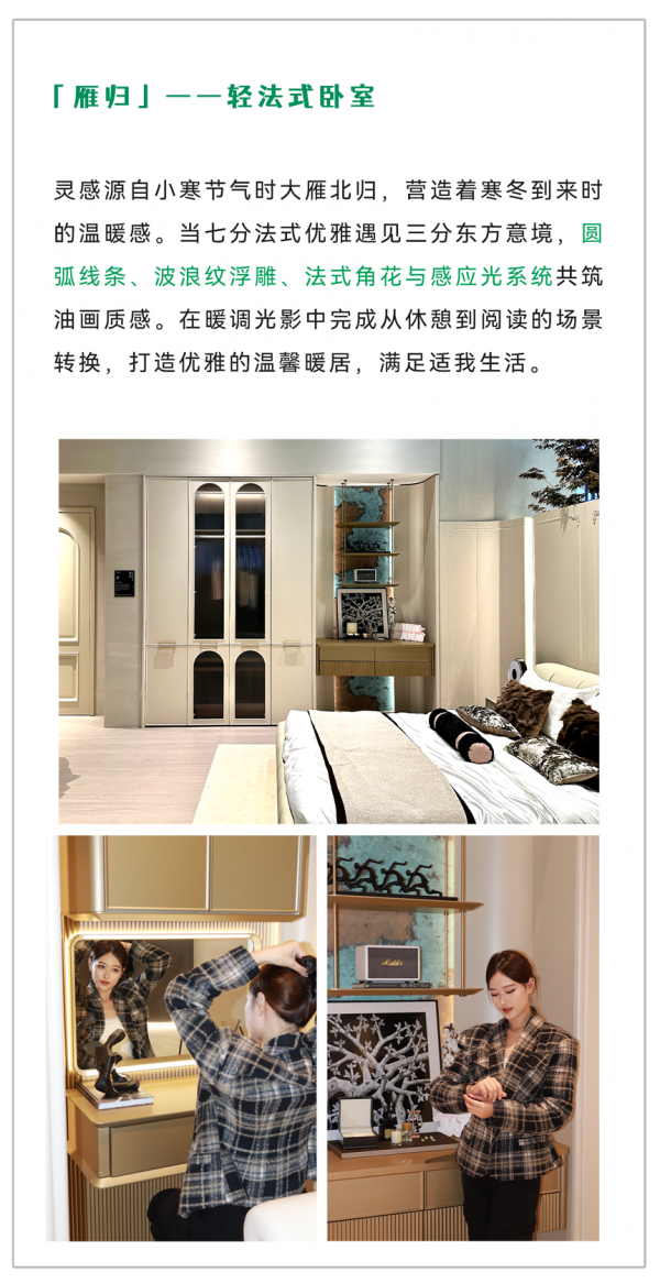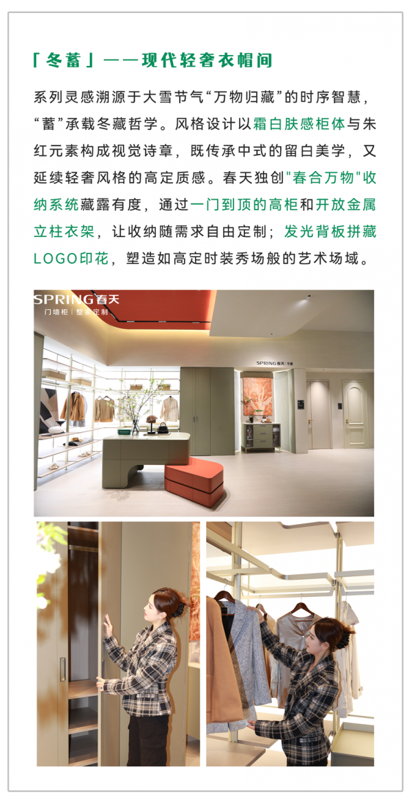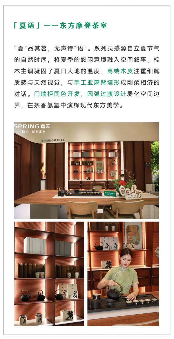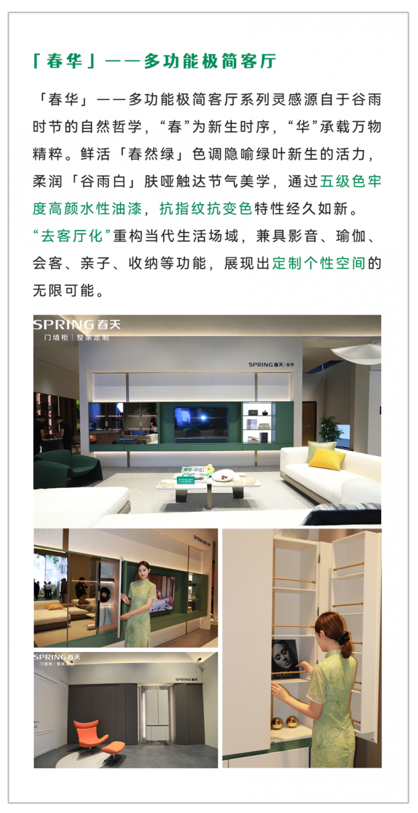 本次参展的产品分别是春华、夏语、秋实、冬蓄、雁归五大门墙柜一体化系列新品,通过工艺、色彩、材质、场景构筑出一个个生动的生活场景,以轻高定的产品品质,不仅展现出高颜值与高品质,更彰显出个性化、多功能与多品类的特色,为消费者带来一场健康舒适、兼具美学与实用的家居体验盛宴。