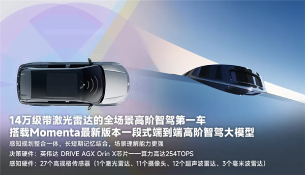 该车配备激光雷达、英伟达Orin X智驾芯片及Momenta高阶智驾系统,可实现端到端智能驾驶。