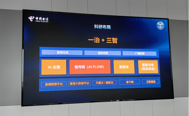 目前,TeleAI 正以智传网(AI Flow)与AI治理、智能体、智能光电(包括具身智能)为核心,形成“一治+三智”的完整科研布局。中国电信凭借自身所拥有的天翼云、骨干网、卫星通信等优势,以及在算力、数据方面精心构建的息壤智算平台、星海大数据平台,为完成这一科研布局奠定了坚实基础。