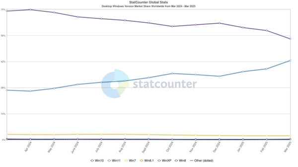 根据Statcounter的最新数据,Windows 11在2025年3月的市场份额显著增长,而Windows 10的市场份额则在短短一个月内大幅下降。