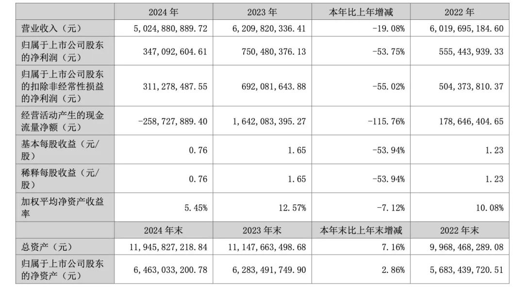 C114讯 4月1日消息(苡臻)近日,航天电器公布2024年年度报告。报告期内,公司实现营业收入50.25亿元,同比下降19.08%;归属于上市公司股东的净利润3.47亿元,同比下降53.75%;归属于上市公司股东的扣除非经常性损益的净利润3.11亿元,同比下降55.02%;基本每股收益0.76元。