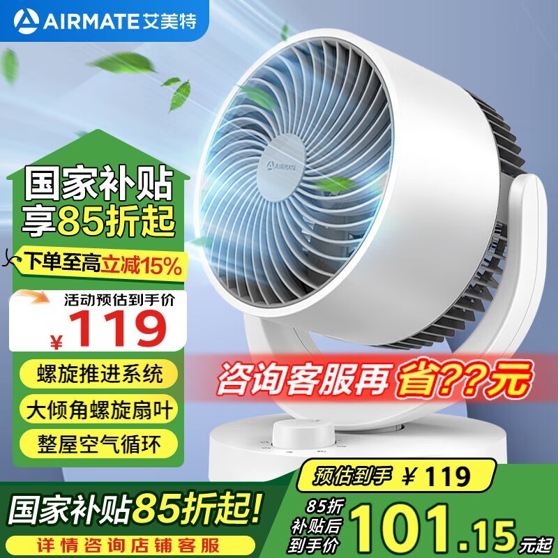 艾美特CA15-X28空气循环扇白色机械款迷你省电省心
