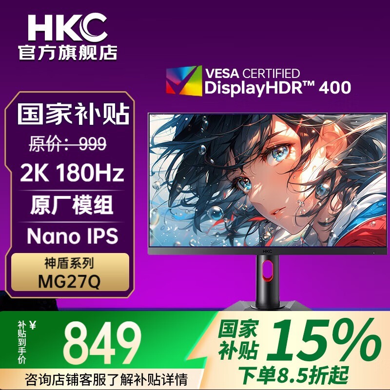 HKC MG27Q电竞屏京东优惠,原价999现849.15