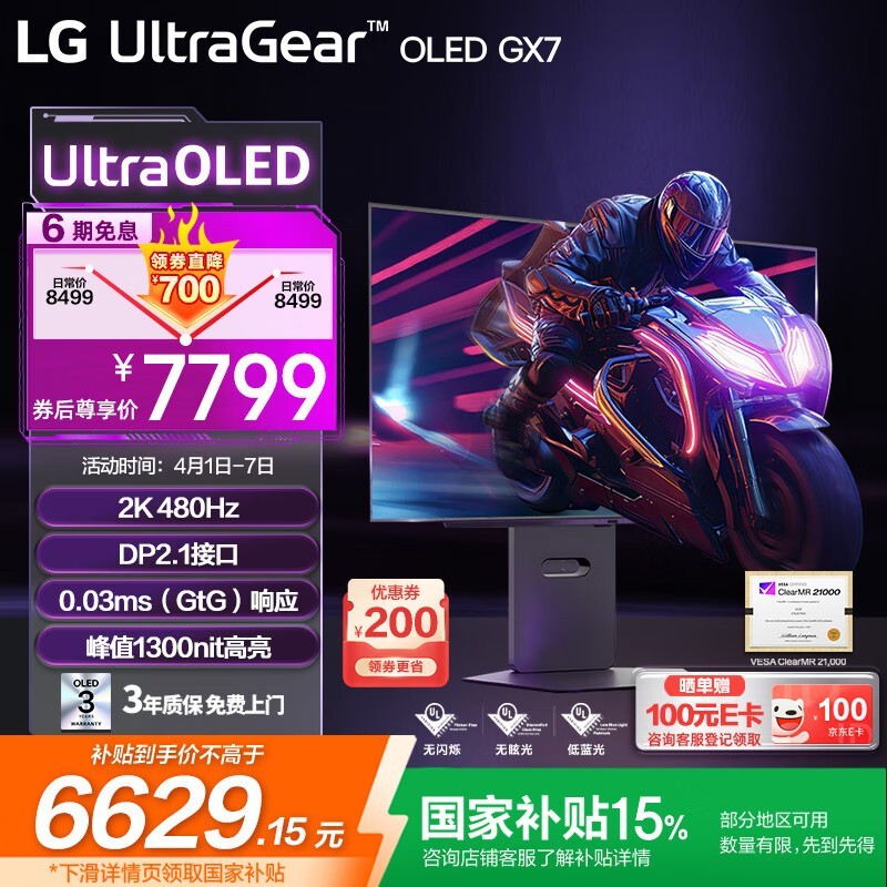LG炫竞GX7电竞显示器27英寸OLED480Hz刷新率2K京东活动价