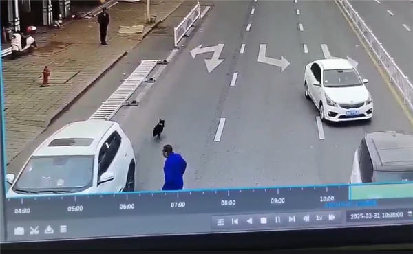 然而开门后,男子似乎被吓了一跳,不由得往后趔趄了下身子,继而“始作俑者”从车内蹿出——一条黑白相间的狗。