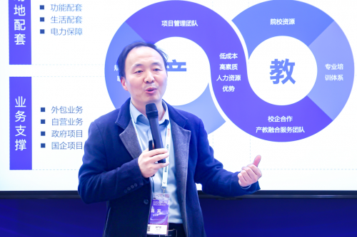 中开集团日照模式的成功,离不开政府、企业与院校的三方深度协同。郭广超在分享中重点介绍了集团在政府的大力支持下与日照航海工程职业学院、山东水利职业学院等院校的合作案例。例如,与日照航海工程职业学院共建的“中开数字经济产业学院”,通过“工学交替”模式,将企业项目引入课堂,学生既能在校内基地参与数据清洗、数据标注、数字建模、AI数据标注人工审核等实战项目,也能在园区职场接受行业导师指导,最终实现高质量就业。