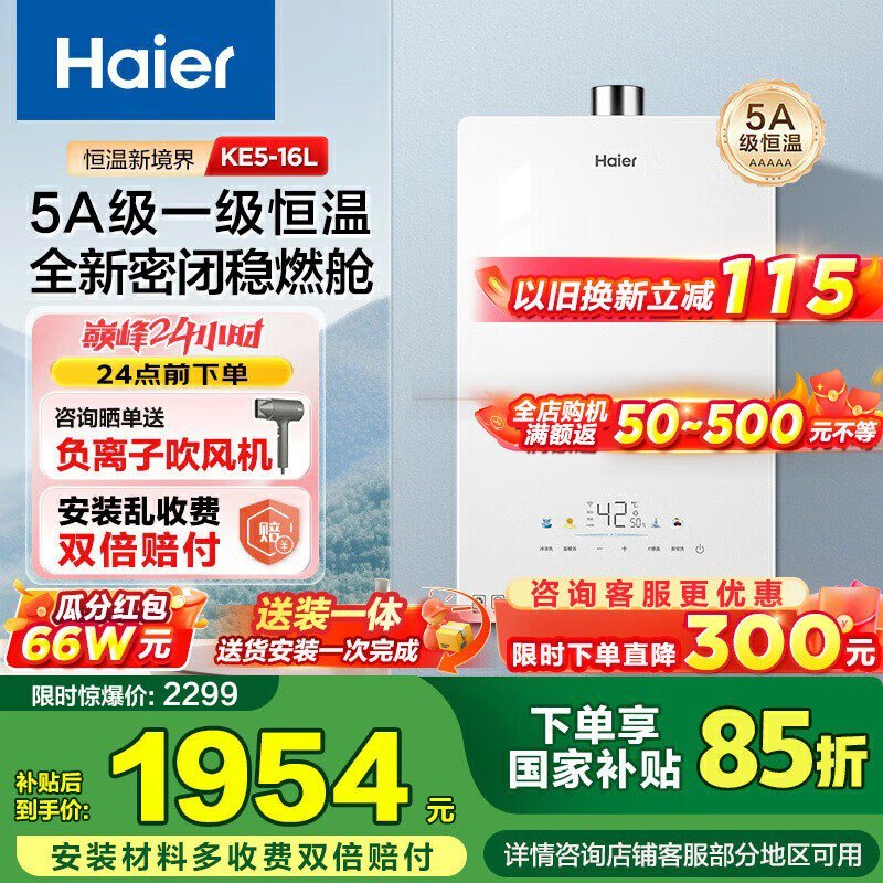 海尔16L燃气热水器,优惠后到手1701元