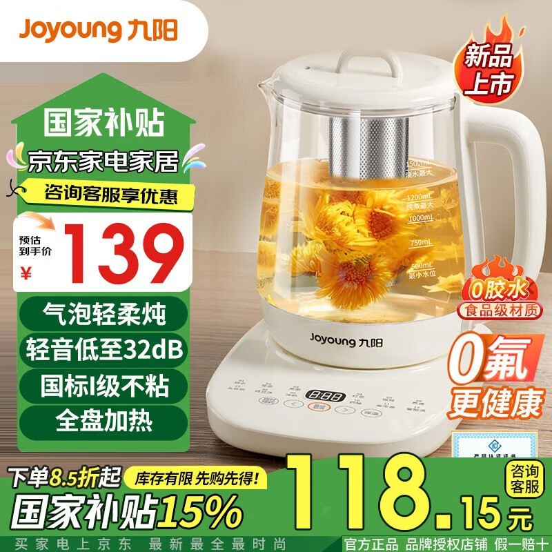九阳W111电热水壶1.7L大容量快速烧水安全耐用仅58.66元