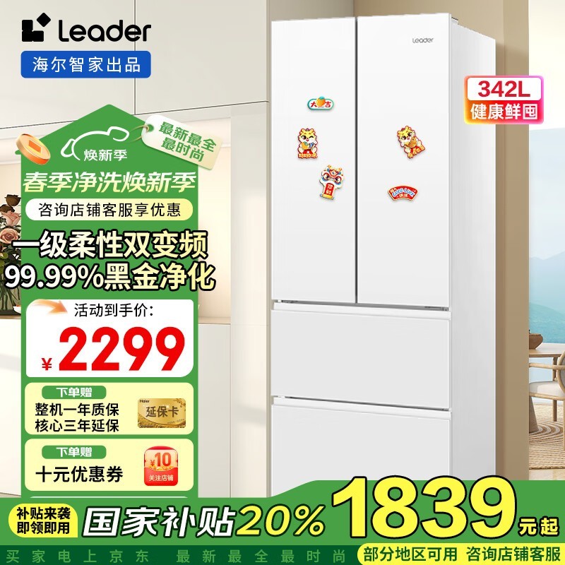 Leader海尔BCD-342WLLFDEDW9U1风冷多门冰箱双变频2499元包邮