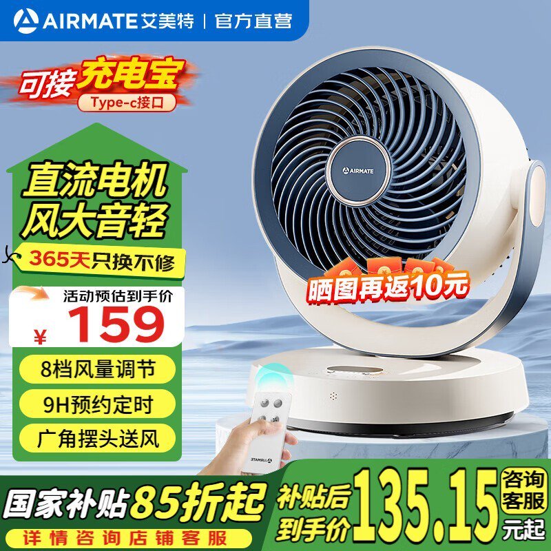 艾美特FA15-R126空气循环扇直流电机遥控功能舒适体验