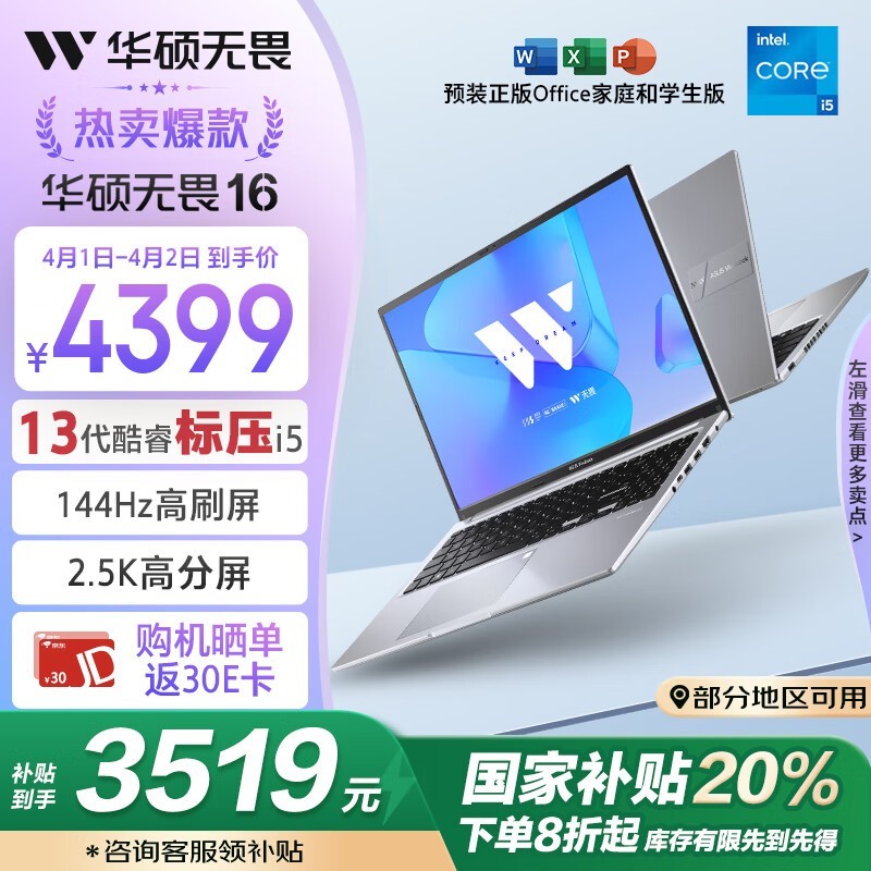 华硕无畏16十三代酷睿版轻薄本京东促销低至3471元