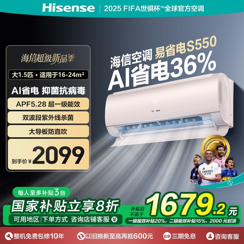 海信Hisense 1.5匹空调挂机到手价1560元