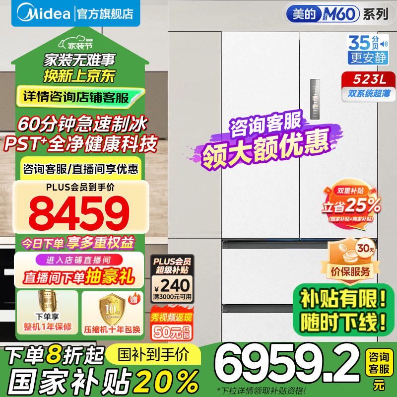 美的532L多门冰箱嵌入式设计果蔬保鲜到手价6717元
