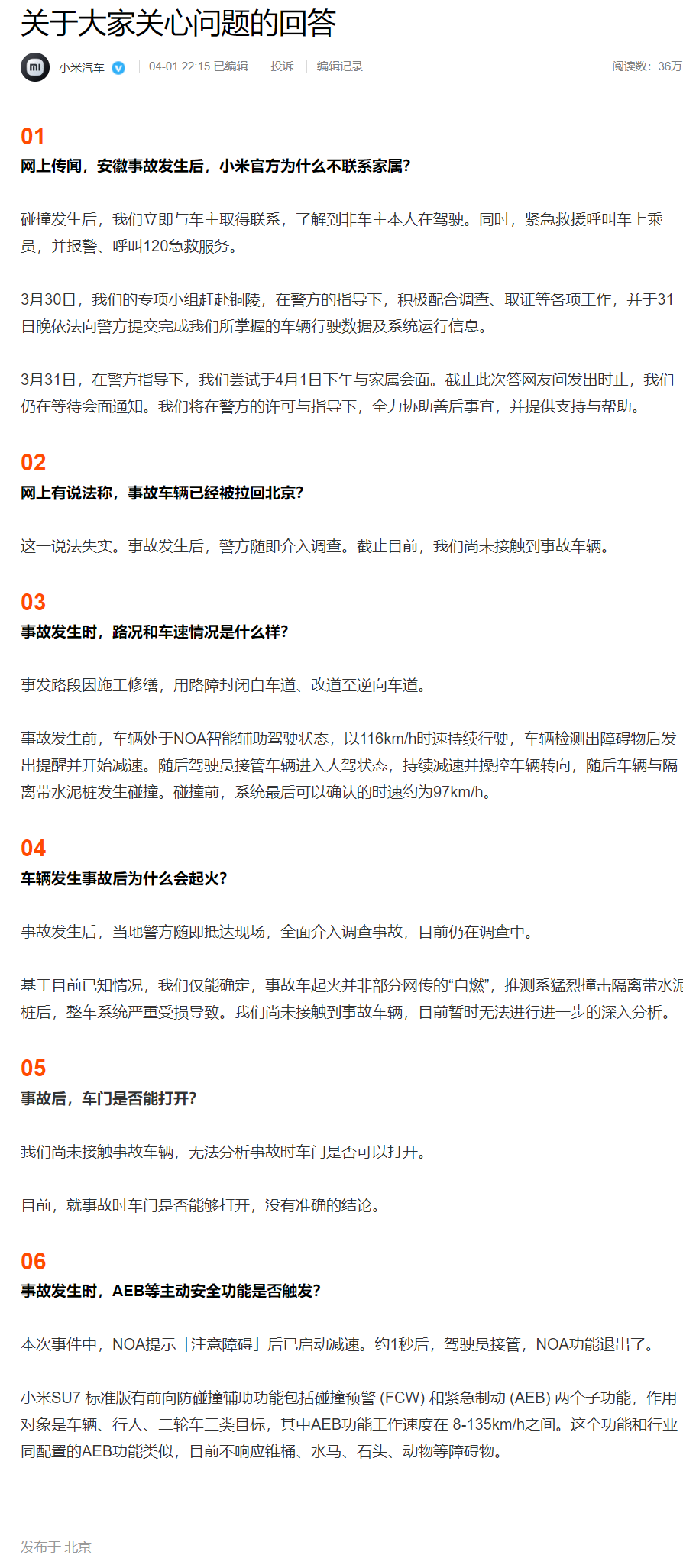 4月1日深夜,小米汽车发文《关于大家关心问题的回答》,全文如下。