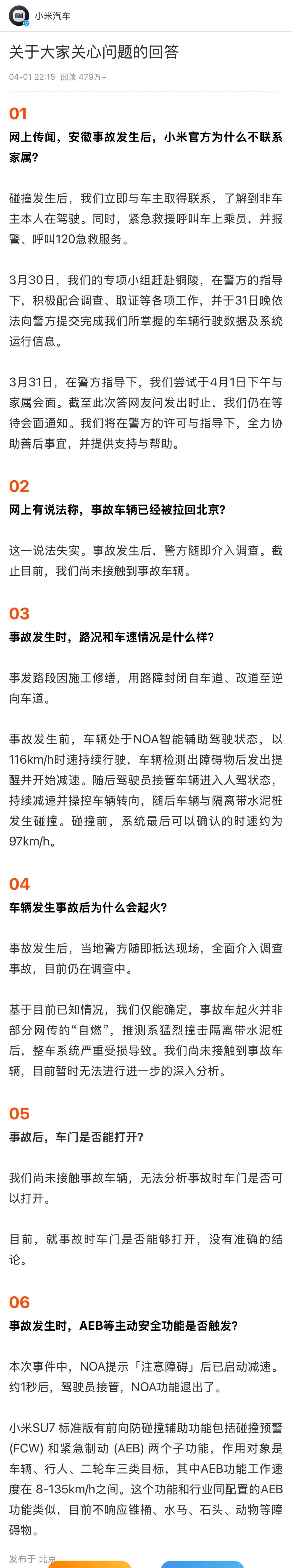 针对为何没有联系家属、车辆是否被拉回北京、事故后车门是否能打开等问题,深夜小米汽车在回答网友提问中进行了回应。