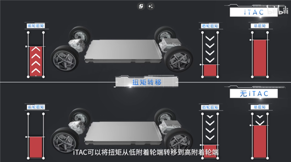 算得准反应自然就快了,配合算法,iTAC 可以预测车身未来的动态,通过智能分配前后电机的扭矩去救车。