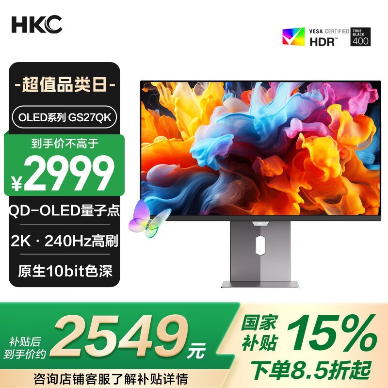 HKC GS27QK显示器京东优惠,江苏有补贴