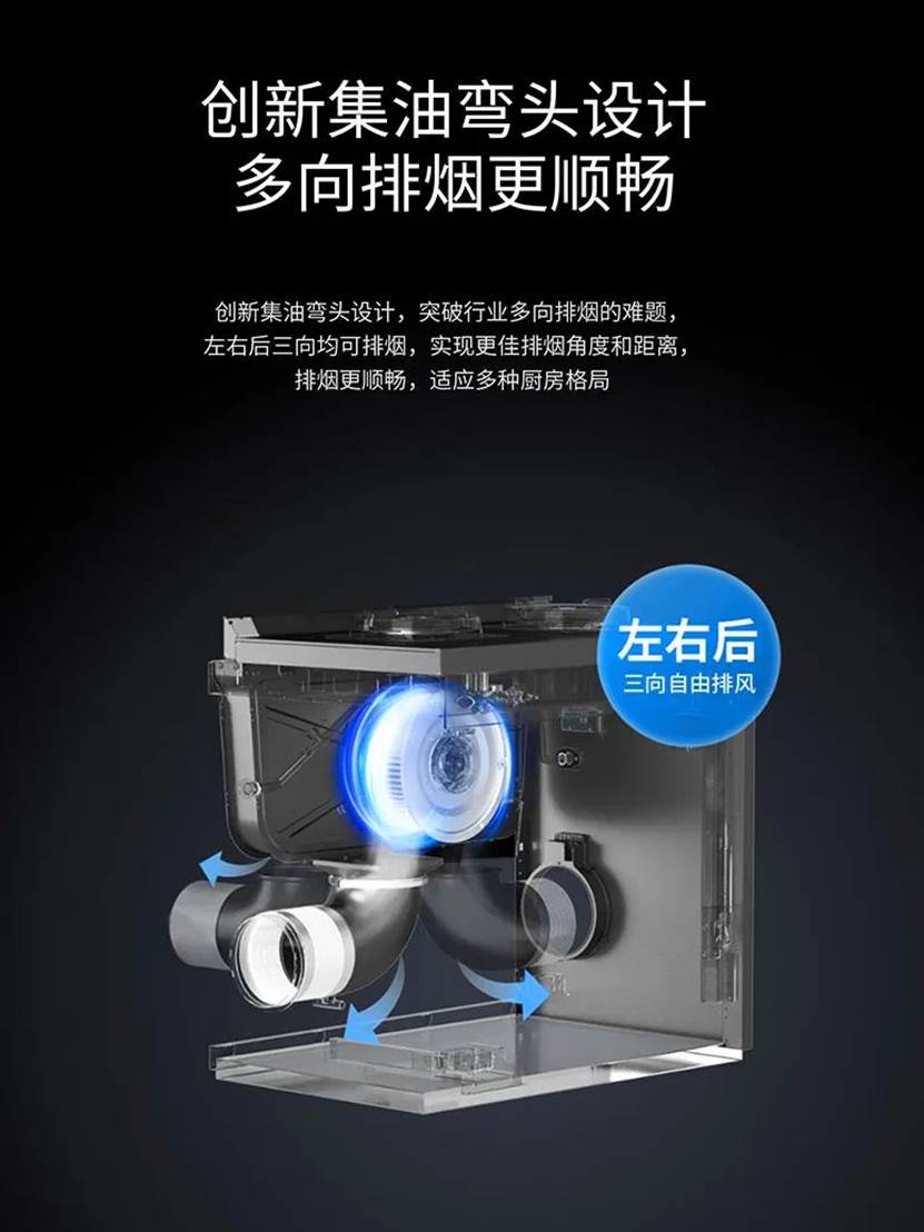 美大集成灶创新集油弯头设计,左右后三向均可排烟,适应多种厨房格局。可以根据实际情况,选择排烟方向,既确保了日常动线的流畅性也不受烟道位置的困扰。