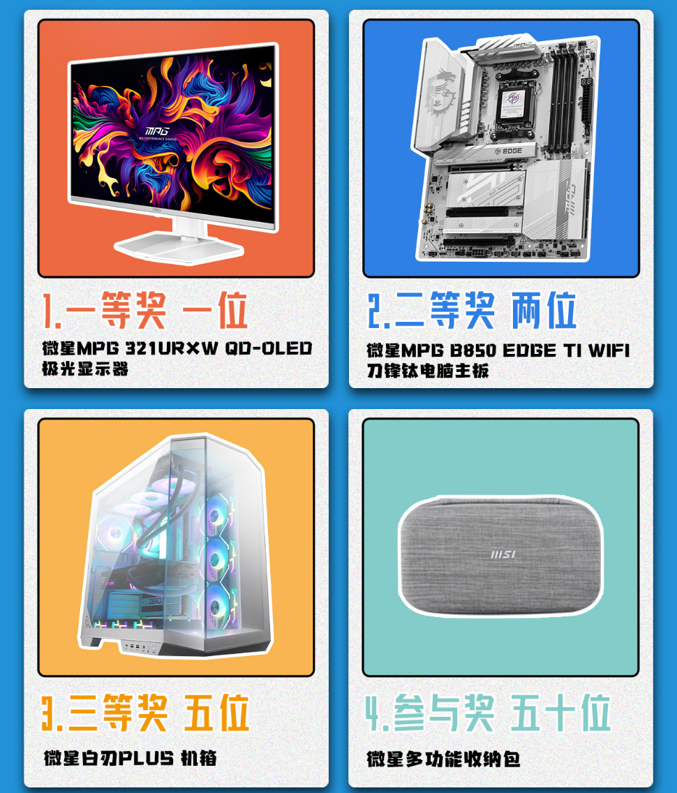 亚军(2名):微星MPG B850 EDGE TI WIFI刀锋钛主板(价值?2199),银白色炫酷颜值,豪华供电设计,解锁极致超频潜力;