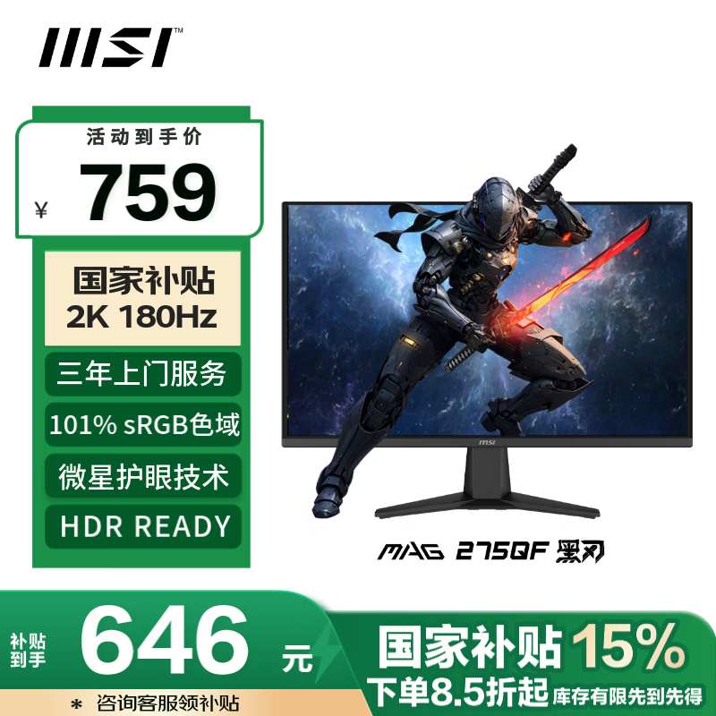微星MAG275QF黑刃电竞显示器27英寸2K180Hz京东到手641元