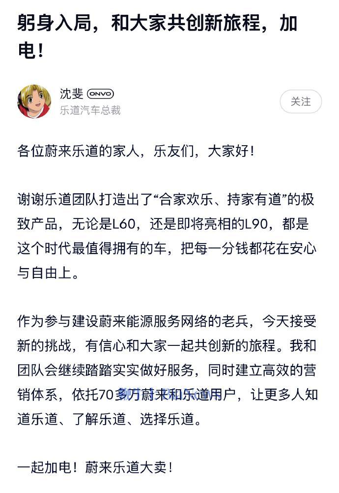 沈斐回应出任乐道总裁:躬身入局,将建立高效的营销体系