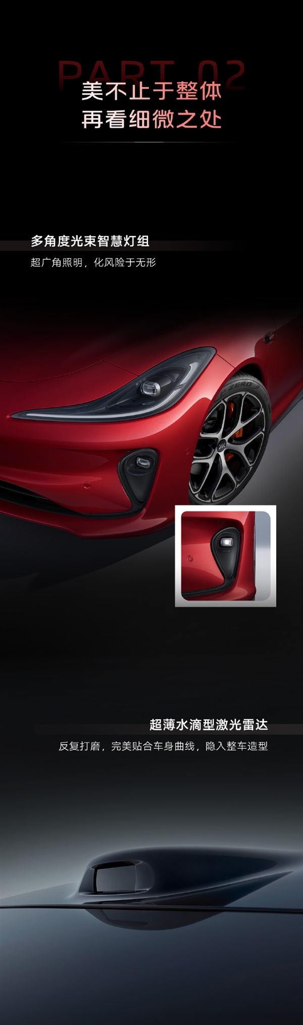 外观方面,新车采用红色车漆,车标上移,激光雷达尺寸缩小,有望降低风阻系数。